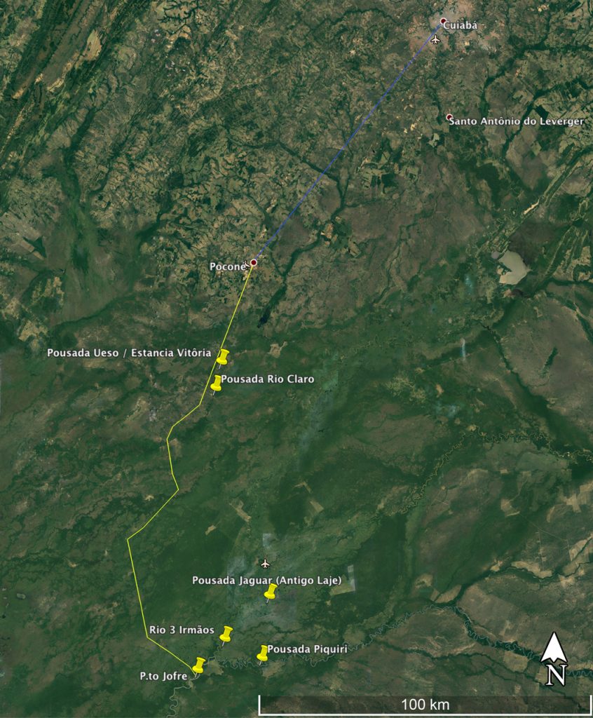 Arrivée à l’aéroport de Cuiabà. Départ en avion privé avec destination “Pousada Piquiri”, situé au bord du rivière Piquiri, affluent du rivière Cuiabà (1 heure et demie, de vol de Cuiabà) dans l’une des zones de plus grande présence du jaguar dans le monde.